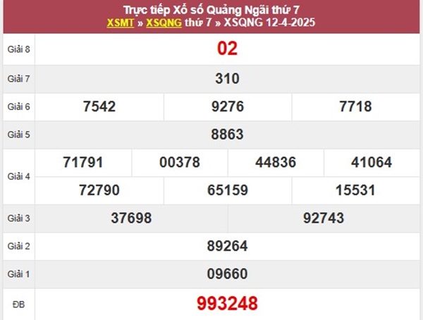 Phân tích XSQNG 19/4/2025 kỳ trước với giải đặc biệt, giải 8, lô về nhiều nháy, đầu số về nhiều và lô câm chi tiết nhất giúp người chơi đưa ra được tham khảo chuẩn xác nhất. Mời các bạn cùng xem lại bảng kết quả chiều tối ngày hôm thứ 7 ngày 12/4/2025